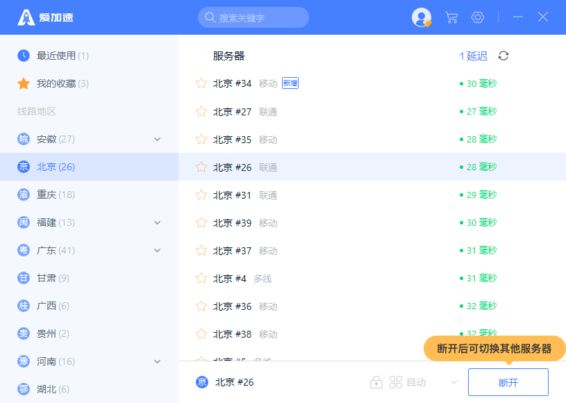 4. 服务器列表分为“最近使用”、“我的收藏” 以及全部线路地区,点击服务器前端“星标”即可收藏线路,再次点击即可取消收藏,收藏的线路保存在“我的收藏”。